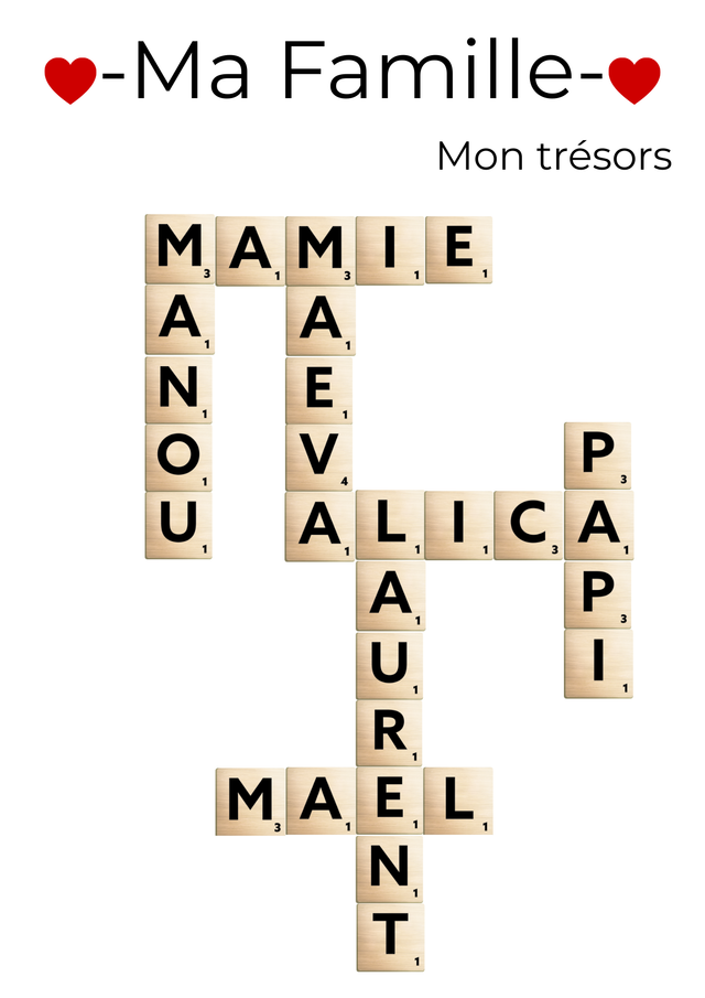 Affiche personnalisés façon scrabble mettent en lumière les prénoms de votre famille, entrelacés comme les liens qui vous unissent.